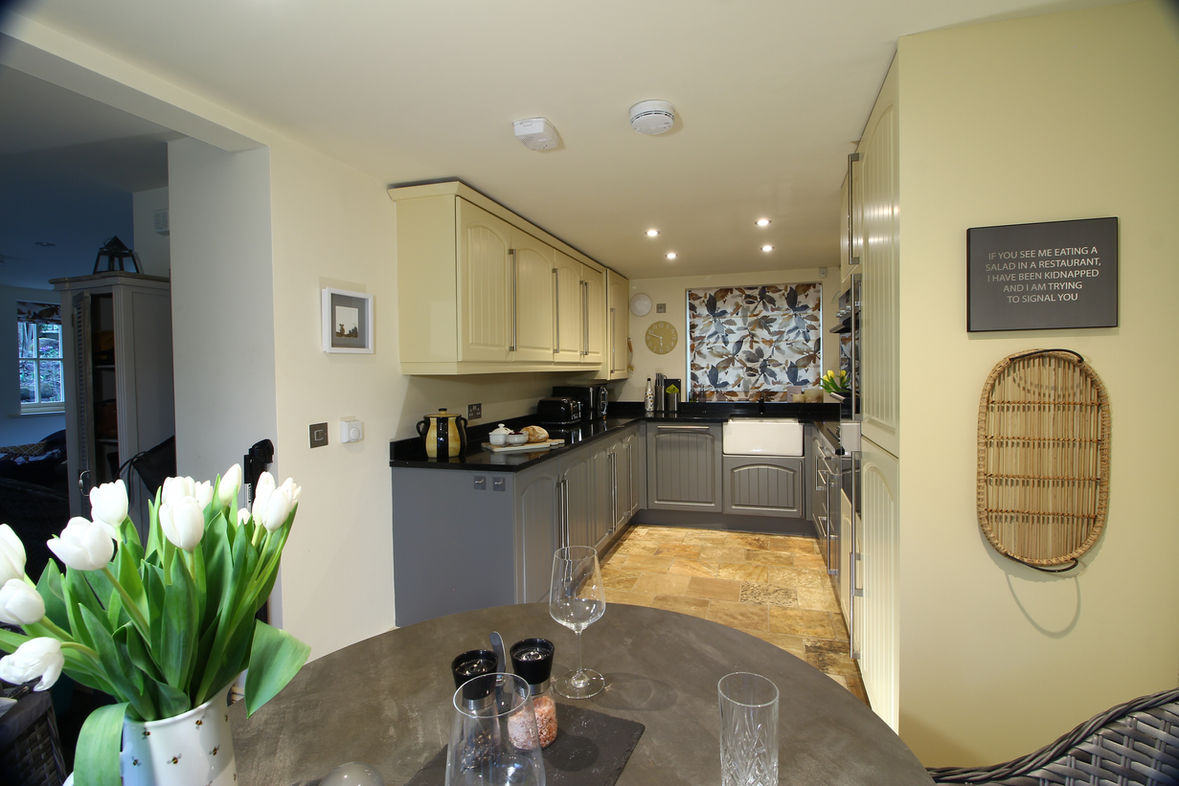 A hand-painted kitchen/dining area with a butlers sink, stone surfaces, large fridge freezer (capacity for your weeks supply of fresh or frozen food!); electric ovens with gas hob, microwave, dishwasher, washing machine – and plenty of storage, beyond the fully equipped space, for the inner chef! Comfortable dining for four looking out over the garden and woodland beyond